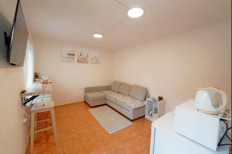 - Šviesus kambarys su dvigule lova, bendra virtuve ir bendru vonios kambariu – puikus pasirinkimas poroms.