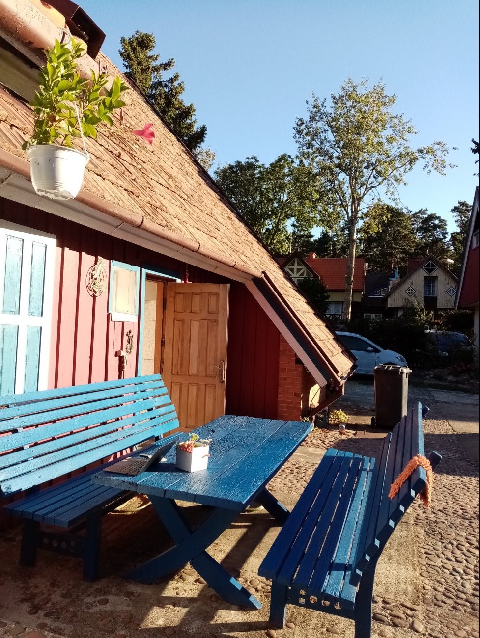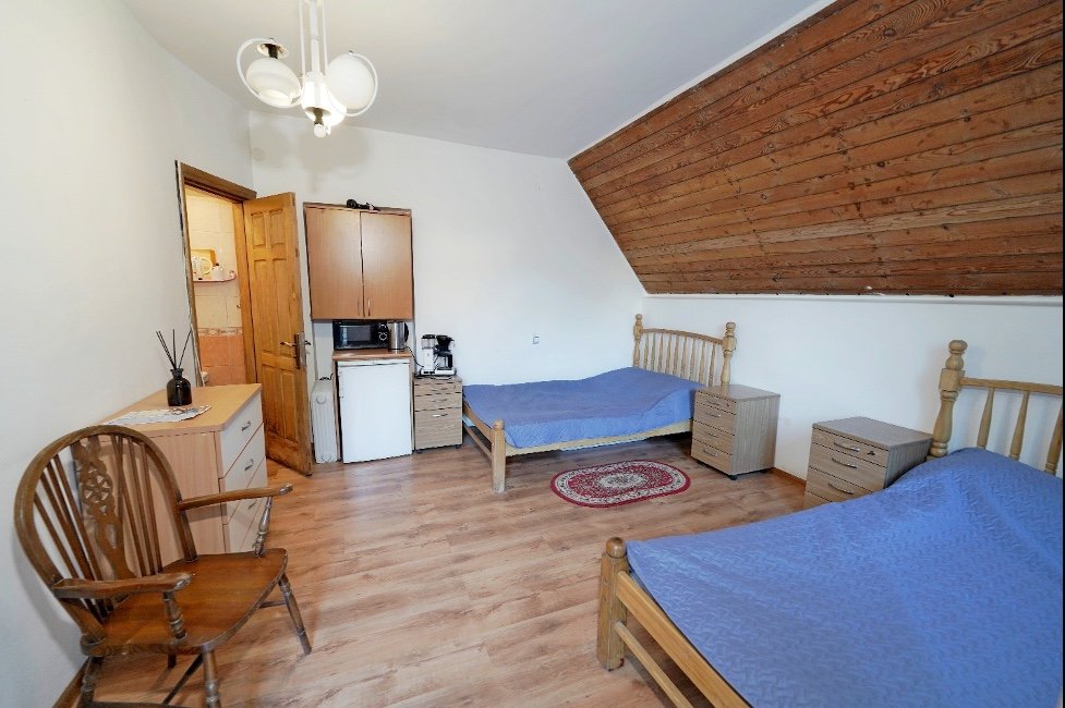 Keturvietis kambarys su benrdrais patogumais namelyje kieme II aukšte. Yra lauko staliukas. Kaina 55 eur./parai.